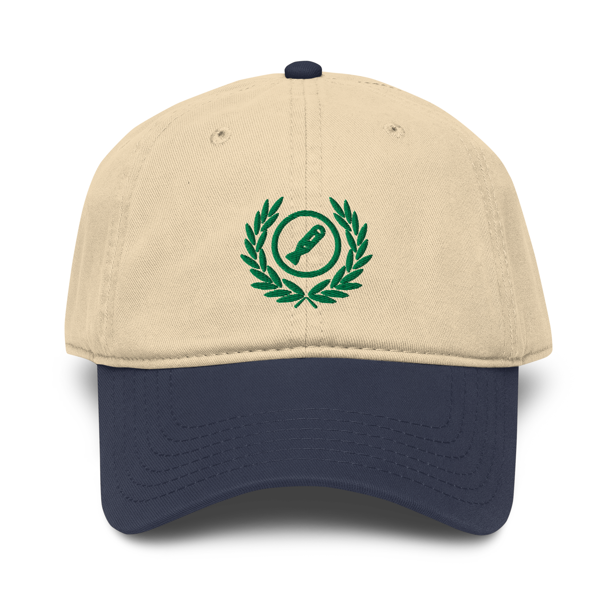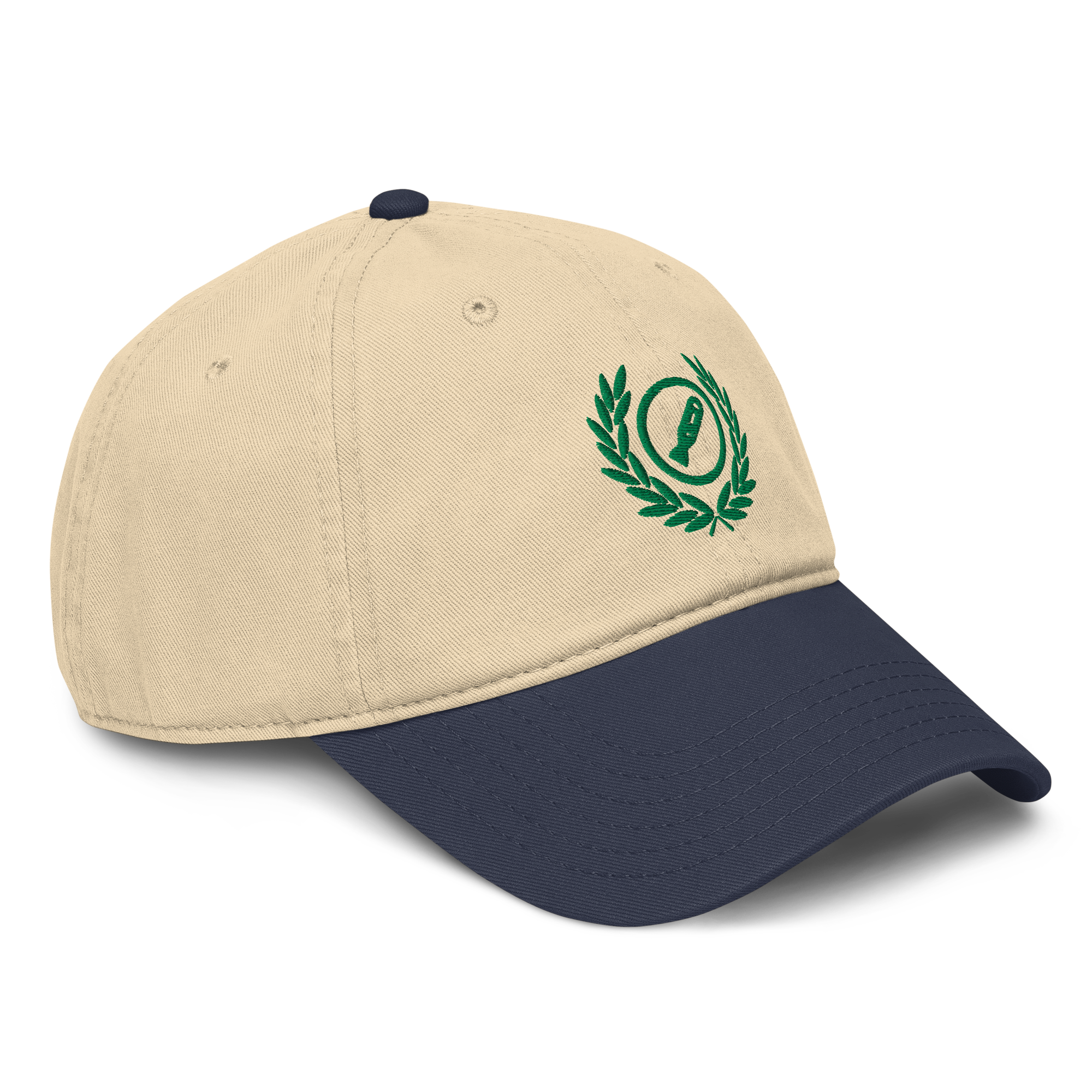 khaki and navy color block cap with Kelly green embroidery